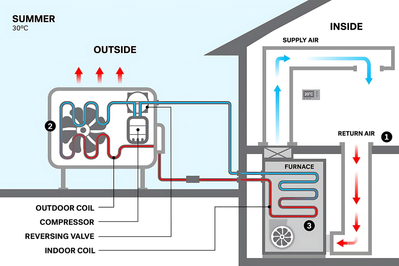 1. In cooling mode, the heat pump works just like an air conditioner by first removing unwanted heat from the home.