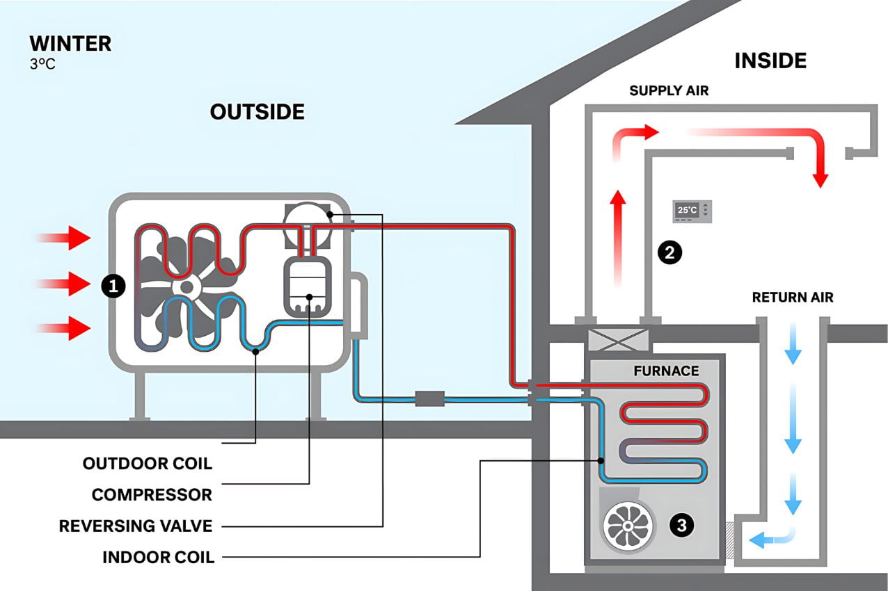 1. In the wintertime, the cycle is reversed where the heat pump pulls heat from the outdoor air and is absorbed by the refrigerant.